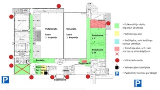 - Kilpailukansliana toimii kokoustila UT1, joka löytyy aulan vasemmalta puolelta, palloiluhallin päätyikkunaa vastapäätä.