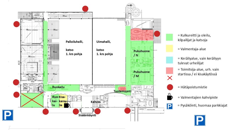 - Kilpailukansliana toimii kokoustila UT1, joka löytyy aulan vasemmalta puolelta, palloiluhallin päätyikkunaa vastapäätä.